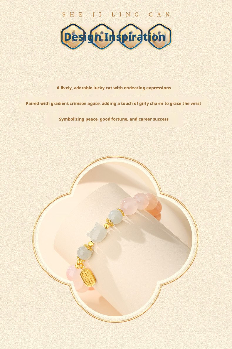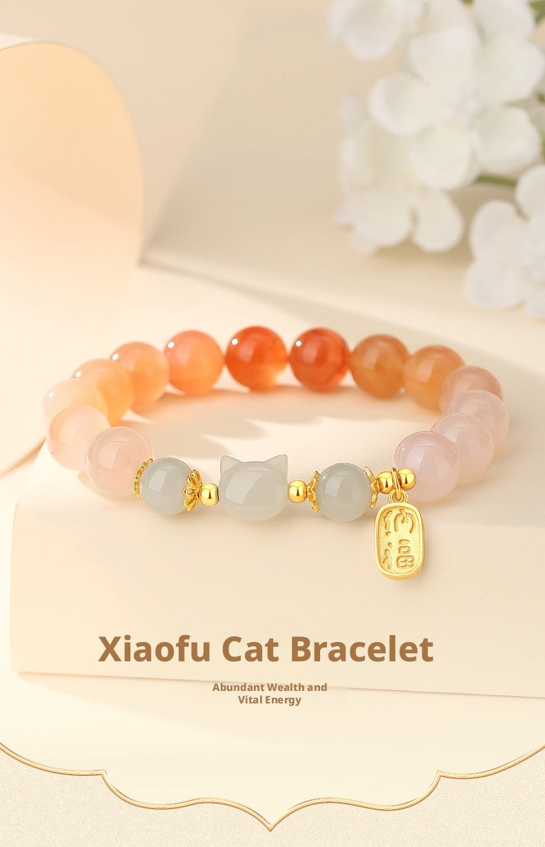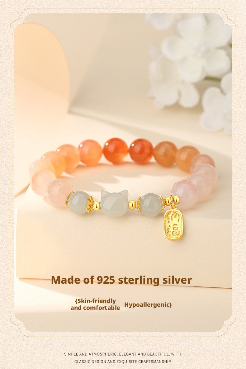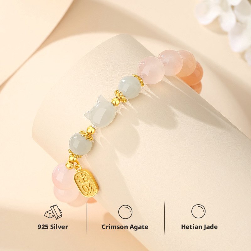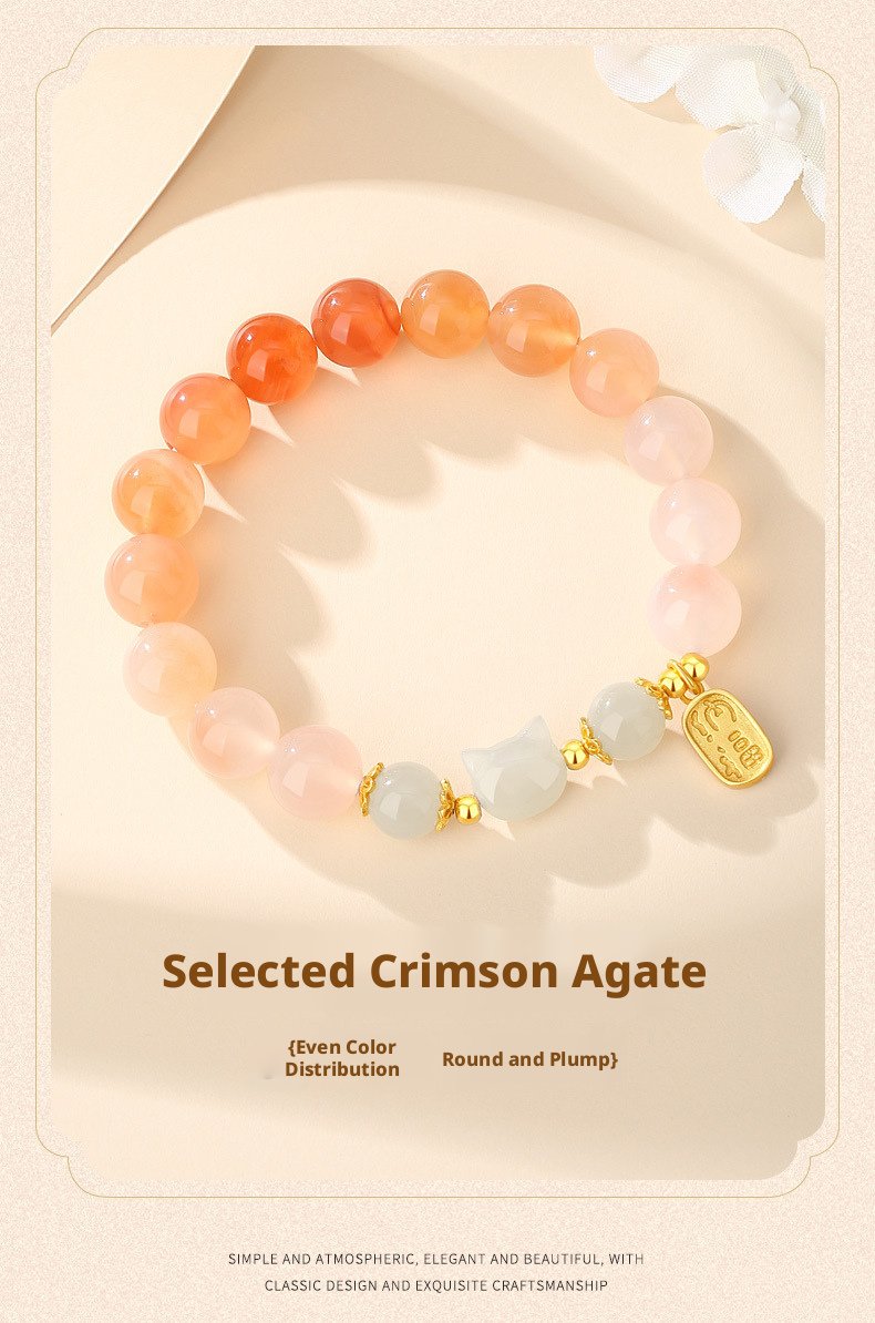 Featuring a delicate cat charm with natural crimson carnelian, this piece carries traditional Oriental meaning—crafted as a heartfelt symbol of warm blessings and gentle positive energy for daily wear or gifting.