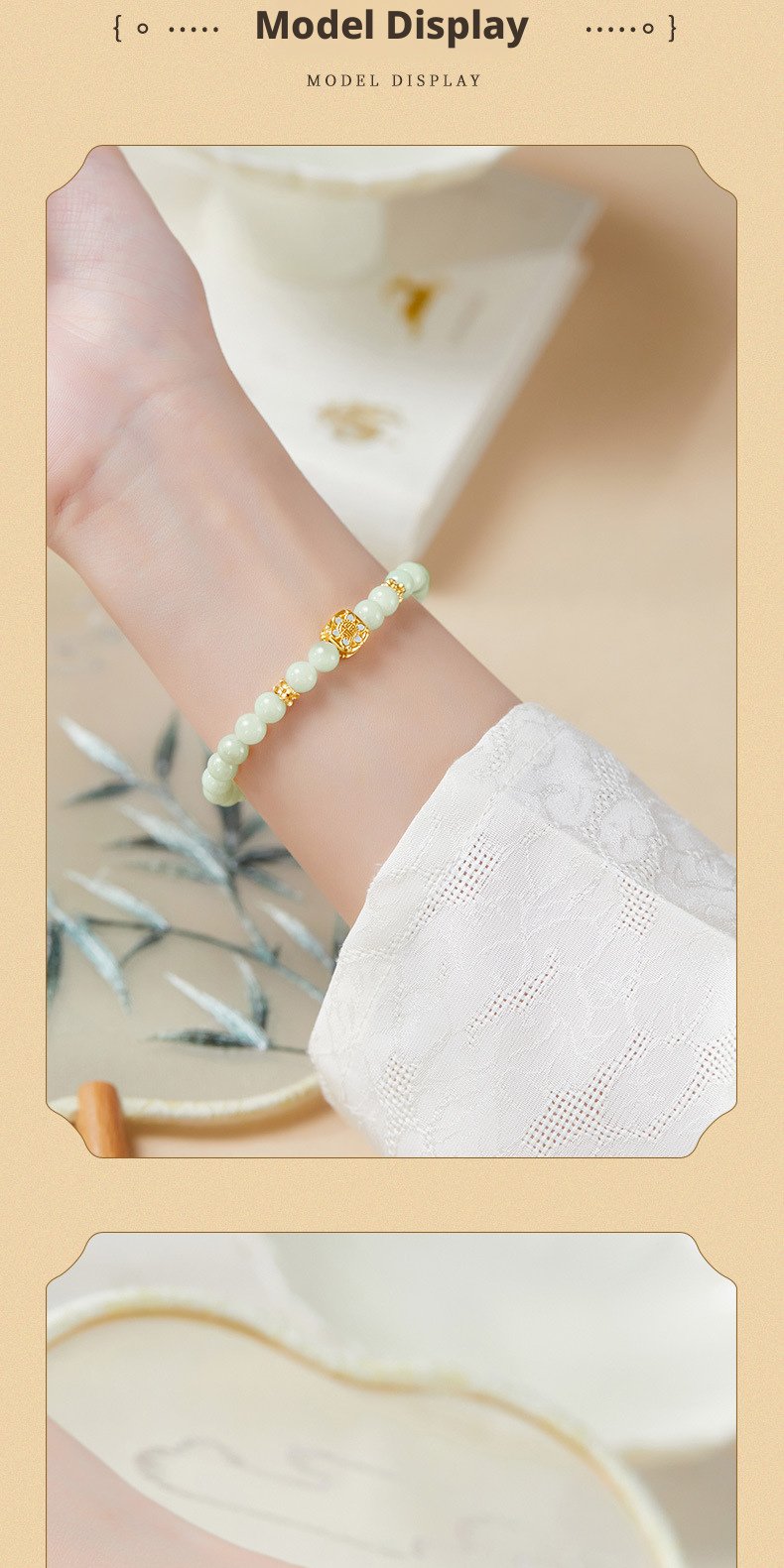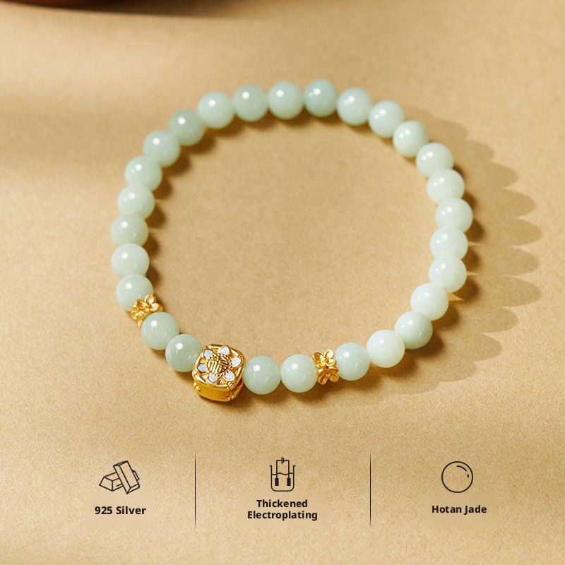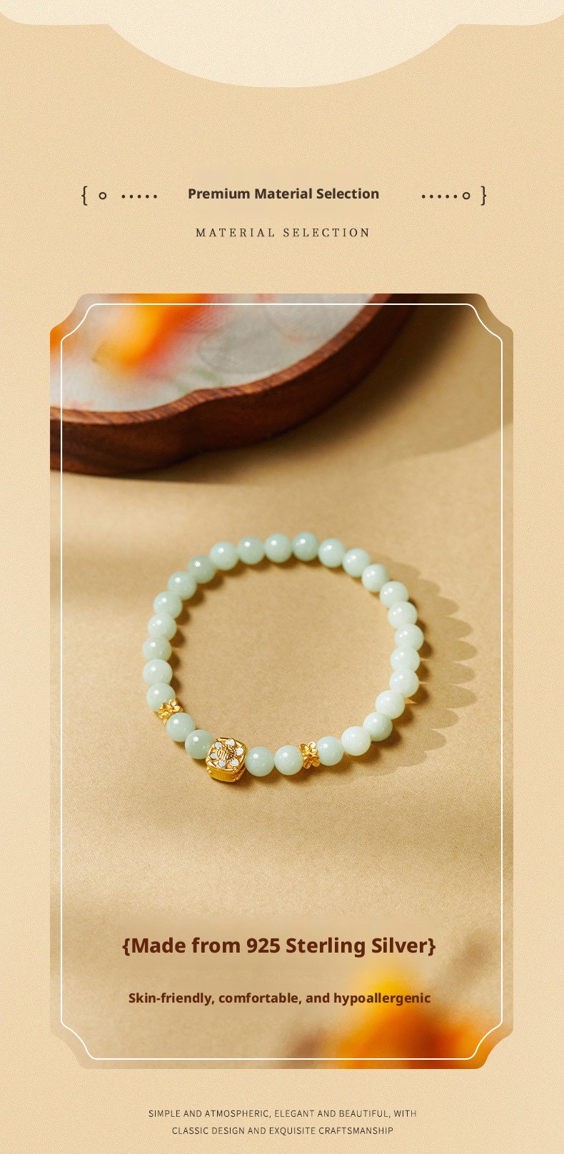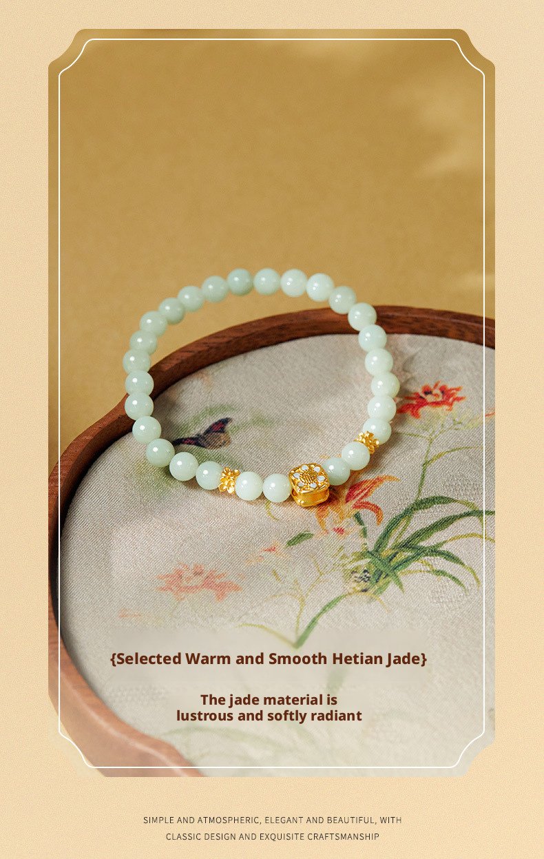 This elegant sterling silver bracelet features a traditional Oriental fortune tag, natural Hetian jade, and a classic white chalcedony peace disc—crafted as a timeless symbol of peace, calm energy, and heartfelt cultural blessings for daily wear or gifting.